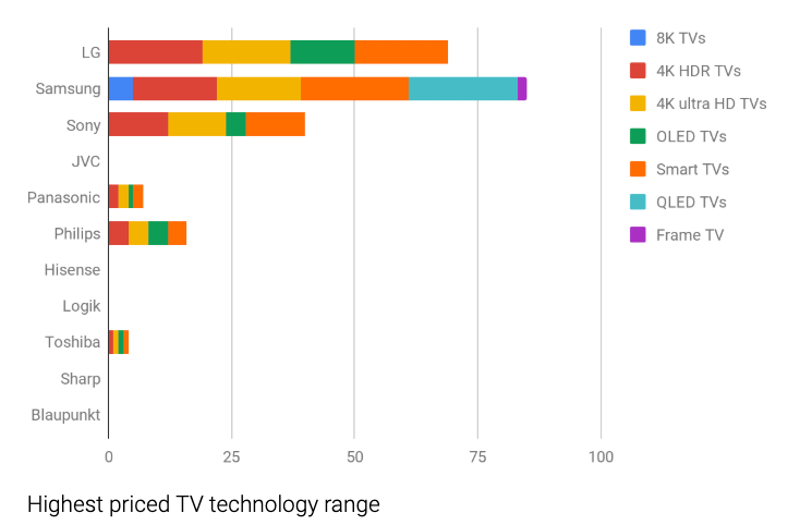 As seen in the graph above LG is the biggest competitor with a bigger range of products. Being Samsung the brand that indexes higher than any other in the high end expensive range.