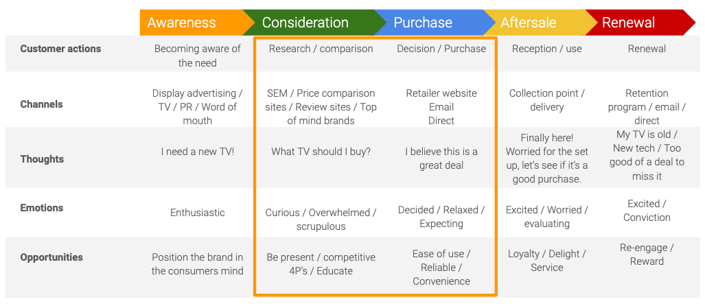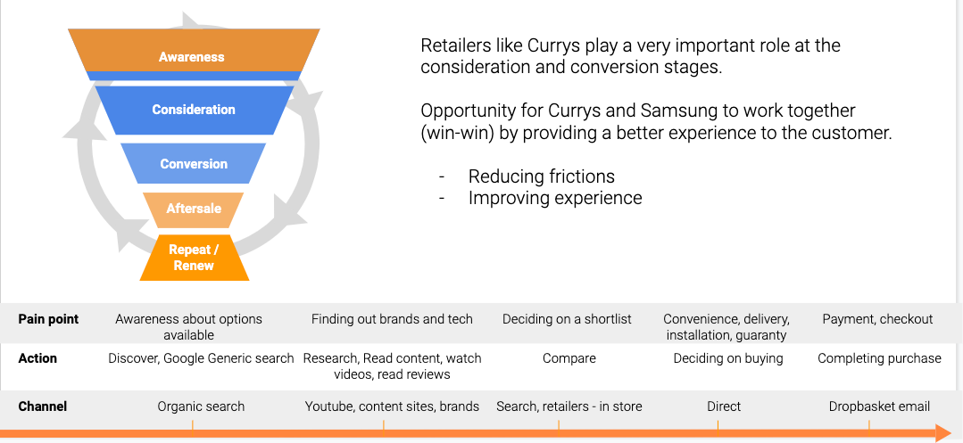 I will use an example on how we can optimise the experience and user journey of someone who is thinking about getting a new TV. I had recently presented a user journey optimisation plan for Samsung TV with their retailers in UK. I believe this is a really good example to illustrate the process.