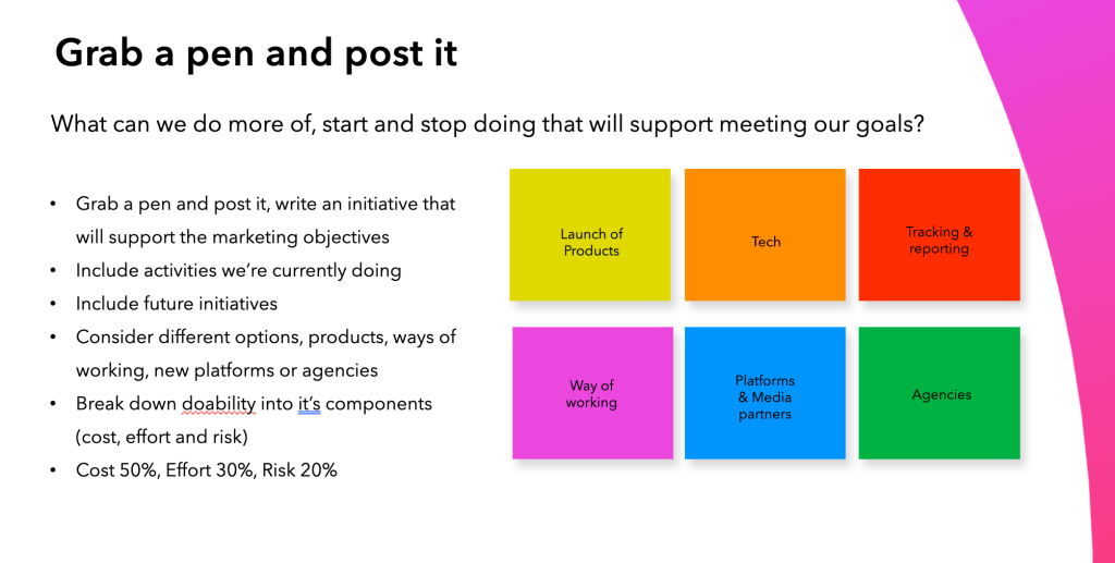 If you’d want to find a way to develop a solid marketing plan where you, your team and other members will feel involved and reassured it’s the way forward. If you want to do this in a simple way and in a short session, continue reading. I’ve used this on several occasions, providing clear direction, alignment, and certainty on the priorities to focus on.