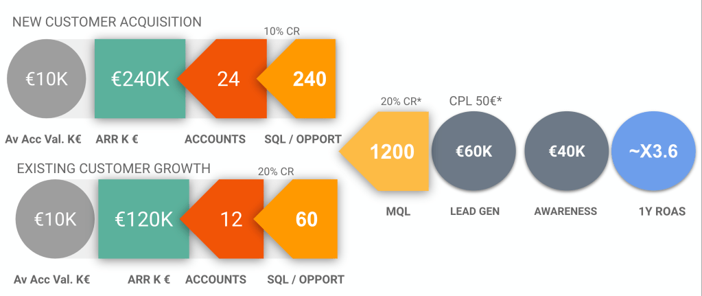 To do this forecasting exercise we have to look at it as if it was a funnel. Revenue comes from customers, customers are acquired through leads, leads are generated through media/advertising. But we need to take into consideration that the revenue will come from two sources. Existing customers and New customers.